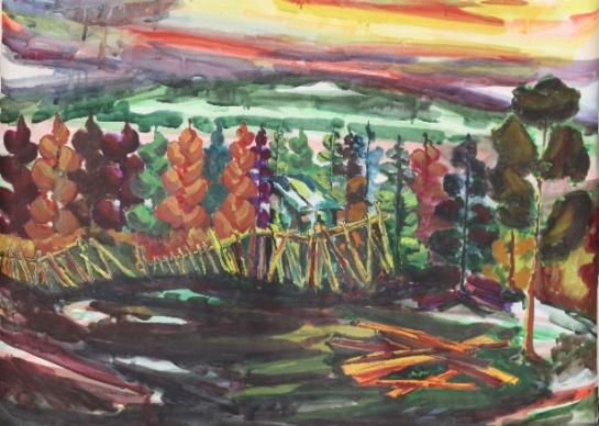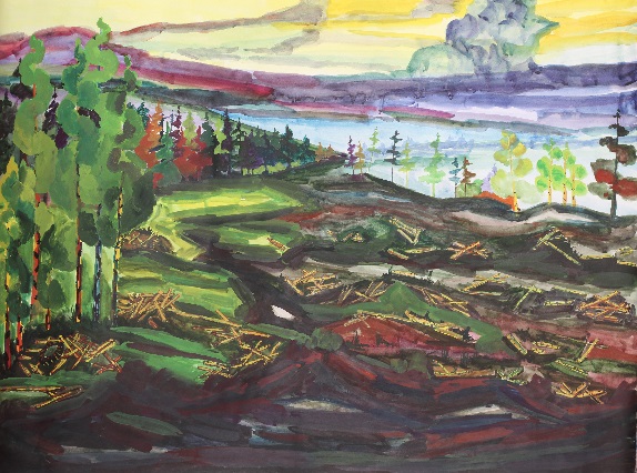 Несомненно, чтобы увидеть душу художника, понять его мысли и чувства, надо взглянуть на его работы. Большое место в творчестве Татьяны Саблиной занимает тема природы. Например, в ее картине «Боль тайги» изображена острая проблема нашего города – вырубка леса. На месте тайги после деятельности человека в погоне за деньгами остались вырубленные деревья и пни. Так молодая художница пытается призвать людей беречь и любить природу.