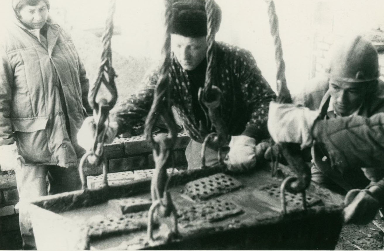 Когда клали шахту главного лифта на варочном цехе, сначала, начиная от пола, работая внутри, довели его до 51 отметки. Внутри – это когда леса ставятся с самой шахте лифта. А потом кирпич и раствор пришлось подавать через крышу. Настелили щиты, чтобы не нарушить покрытие крыши. Кран ставил на нее поддоны с кирпичом и бадьи с раствором, и потом мы тачками перевозили их к шахте лифта и доставляли на леса подъемником. Здесь клали лифт снаружи, поставили по периметру шахты леса высотой около 30 метров, семь стоек по 4 метра каждая, одну на другую. На них подъемником доставляли кирпич и раствор и перегружали на леса. Закончили кладку почти на 100 метровой высоте, вниз посмотришь, там, на земле, люди крохотные, как муравьи.