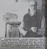 Геннадий Максаков - участник городских и областных выставок. Его кисти принадлежат сотни работ, где автор отдает предпочтение пейзажу. В 1987 году, будучи директором ДХШ №1, Геннадий Петрович заочно окончил художественно-графический факультет Омского пединститута.