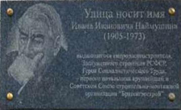 Мемориальная доска Ивану Ивановичу Наймушину установлена 15 сентября 2007 года на доме № 1 на улице, названной в его честь.