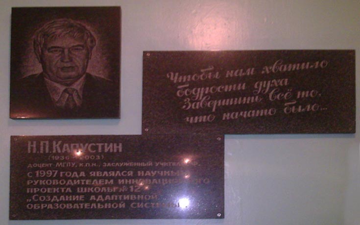 Мемориальная доска Капустину Н.П. была установлена в сентябре 2003 года в школе № 12, чье имя она носит.