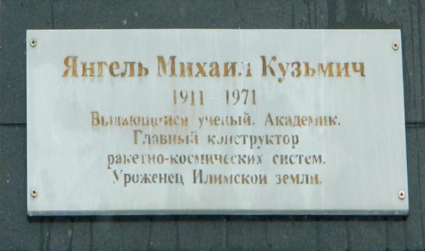 Выдающийся учёный. Академик. Главный конструктор ракетно-космических систем. Уроженец Илимской земли..Янгель Михаил Кузьмич родился 25 октября (7 ноября) 1911 года в д. Зырянова Иркутской губернии. Советский учёный, конструктор в области ракетно-космической техники, академик АН СССР (1966), дважды Герой Социалистического Труда (1959, 1961). Член КПСС с 1931. В 1937 окончил Московский авиационный институт им. С. Орджоникидзе. Работал в КБ Н. Н. Поликарпова (до 1944); принимал участие в разработке истребителей И-16, И-17, двухмоторного истребителя для сопровождения дальних бомбардировщиков и других самолётов. С 1944 работал в КБ Ар. И. Микояна и В. М. Мясищева. В 1950 окончил Академию авиационной промышленности; в 1952—54 директор НИИ. С 1954 главный конструктор КБ. Михаил Кузьмич создал новое направление и свою школу в разработке ракет и космических аппаратов различного назначения, внёс существенный вклад в развитие международного сотрудничества социалистических стран в области спутниковых исследований, а также в изучение верхней атмосферы и околоземного космического пространства по программе "Космос". Золотая медаль АН СССР им. С. П. Королева (1970). Кандидат в члены ЦК КПСС в 1966—71. Депутат Верховного Совета СССР 7—8-го созывов. Ленинская премия (1960), Государственная премия СССР (1967). Награжден 4 орденами Ленина, орденом Октябрьской Революции, а также медалями.