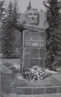 Его похоронили возле плотины Братской ГЭС, памятник делали под руководством скульптора Юрия Русинова. После того, как покрывало упало, многие вздрогнули, они увидели прекрасный скульптурный портрет Наймушина, выполненном в самом трудном и вечном материале – диабазе. Борис Сальников прочитал стихи: