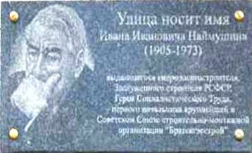 Данная улица названа в честь первого генерального директора Братскгэсстроя Ивана Ивановича Наймушина. И за вышеуказанной стелой стоит дом № 1, на котором 15 сентября 2007 года установлена мемориальная доска в честь этого легендарного человека. Как генеральный директор Братскгэсстроя, Иван Иванович полностью руководил началом стройки. При этом не забывал о людях: создавал условия для работы и проживания, стал инициатором строительства многих объектов соцкультбыта. Поэтому не удивительно, что в нашем городе естьтакая улица.